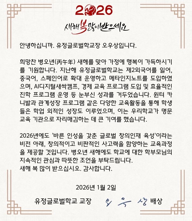 유정글로벌 교육은 자긍심과 배려, 삶을 사랑하는 열정, 미래사회 핵심역량을 갖춘 품격있는 한국인을 양성합니다.